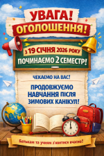 16.01.2026 З 19 січня розпочинаємо ІІ семестр 2025/2026 навчального року
