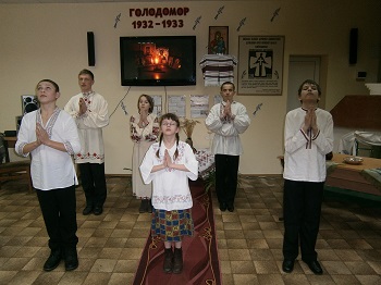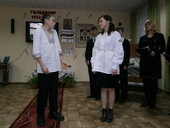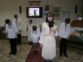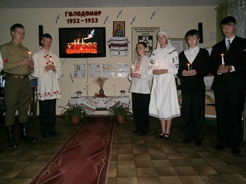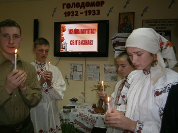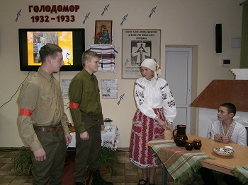 Потрібно повертатися, адже ще живі ті хто був очевидцем та жертвою тих подій, повертатися треба, щоб сучасні молоді українці знали всю правду про ці страшні події, могли їх вивчати й аналізувати, аби не відбулося їх жахливе повторення. | Під час заходу учні та педагоги школи-інтернату дізнались про страшні подробиці трагедії того страшного часу. Вихователі Ліпінська Т.В. та Салантій Л.В. розкрили причини та наслідки Голодомору. Їхні вихованці вразили присутніх моторошними спогадами очевидців тих жахливих подій. | Учні Шаповленко Віталій, Бондарець Вікторія, Білоус Валерій та Клименко Максим інсценували жорстокі дії хлібозаготівельних комісій та партійних активістів, після яких селянські сім’ї залишилися один на один з неминучою голодною смертю. |