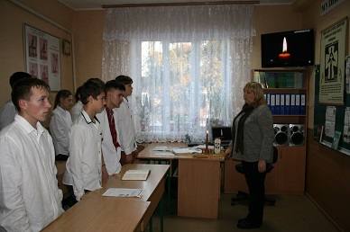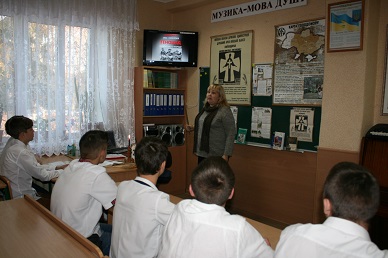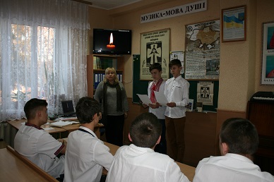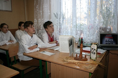 Оглядова екскурсія для учнів 8-10 класів до міського краєзнавчого музею де діти побачили фотодокументальні стенди інформаційно-просвітницького проекту «Спротив геноциду». Шкільний бібліотекар організувала виставку фотоматеріалів та публіцистичної літератури «І пам’яті свіча не згасне…». Під час виховного заходу присвяченого голодомору 1932-33 р.«Чорний птах голодного року»для учнів 8-9 класів діти дізналися, щолюди помирали з голоду тому, що у них насильно було відібрано всі запаси їжі; після Голодомору влада Радянського Союзу заперечувала масове вимирання людей тої страшної зими 1932-1933 років; Голодомор був задуманий для винищення українського народу. Учні переглянули документальний фільм «Голодомор. Великий злам» із серії «Невідома Україна». Школярі вшанували пам’ять померлих під час Голодомору хвилиною мовчання. Сьогодні треба говорити про минуле задля майбутнього, адже безпам’ятність породжує бездуховність, котра, наче ракова пухлина, роз’їдає тіло й душу нації – перекреслює її історію.