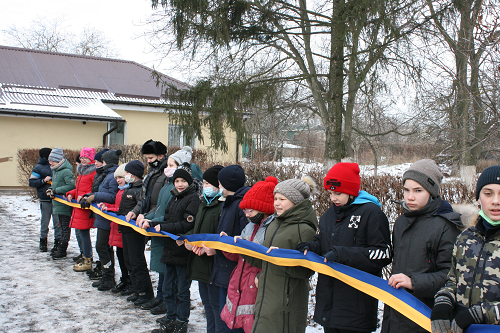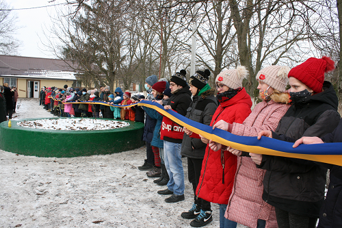 На територіїі школи учні утворили символічний, нерозривний, ланцюг єдності, тримаючи в руках стрічку у кольорах національного прапора України, щоб відчути дух дружби, свободи і гордості за свою державу.