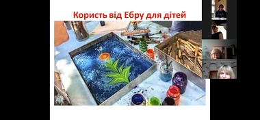 Практичну частину семінару провела вчитель-логопед Бикова Н.М., яка ознайомила педагогів з одним із методів арт-терапії, Ебру-малюванням, який успішно використовується корекційними педагогами, в тому числі для стимулювання мовленнєвої активності молодших школярів. Секрети малювання на воді, красу цієї техніки учасники семінару спостерігали через представлений відео майстер-клас з Ебру-малювання.