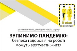 Девіз Дня охорони праці у 2020 році  «Зупинимо пандемію: безпека і здоров’я на роботі можуть врятувати життя»    Відповідно до Указу Президента України від 18.08.2006 р. № 685/2006, щороку 28 квітня в Україні відзначається День охорони праці, девіз якого у 2020 році, за рекомендацією Міжнародної асоціації праці, ,,Зупинимо пандемію: безпека і здоров’я на роботі можуть врятувати життя”.   ШАНОВНІ КОЛЕГИ!    У процесі підготовки до відзначення Дня охорони праці в Україні, яка фактично збіглася в часі з першими проявами «коронакризи», стало зрозумілим, що перед усім українським суспільством постав досі нечуваний виклик, який вимагає особливих заходів та зусиль.    Перші випадки захворювання було зафіксовано у грудні 2019 року, а вже 11 березня 2020 року Всесвітня організація охорони здоров’я оголосила про пандемію через спалах коронавірусної інфекції. Зокрема, генеральний директор ВООЗ Тедрос Адхан Гебреісус заявив: «Це не просто криза охорони здоров’я, це криза, яка торкнеться кожного сектору. Тому кожен сектор і кожна людина повинні бути залучені в боротьбу». Того ж дня постановою КМУ від 11.03.2020 № 211 в Україні було запроваджено карантинні заходи, які в подальшому уряд подовжив і посилив.    З огляду на це, Організаційним комітетом з підготовки та проведення у 2020 році Дня охорони праці в Україні напрацьовано Звернення до органів державної влади, місцевого самоврядування, роботодавців, профспілок, засобів масової інформації, керівників і працівників підприємств, установ та організацій з нагоди Дня охорони праці в Україні, Контрольний перелік заходів та тематичний постер.     Згадані матеріали можна завантажити в електронному вигляді за посиланням: http://files.mip.gov.ua/files/2020/laborday/ логін доступу: mip пароль доступу: mipmip    В умовах глобальної пандемії нового коронавірусу для запобігання поширенню інфекції, захисту здоров’я громадян та надання допомоги хворим, суспільство має об’єднати зусилля заради подолання наслідків епідемії.    Підсумовуючи зазначене, закликаємо всіх долучитися до відзначення Дня охорони праці в Україні та забезпечити широку інформаційну кампанію для захисту та збереження життя та здоров’я працівників.
