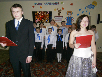 прибраному, в осінніх мотивах залі, глядачі зустрічали ведучих свята. Із уст яких