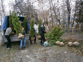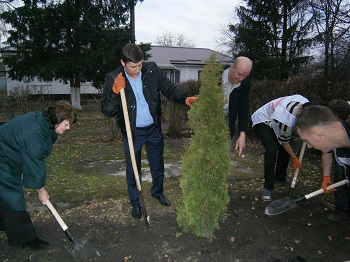 на території закладу. |  |  |  | Саджанці дерев, 25 туй та 10 грабів подарував школі Руслан Григорович Бадаєв. Незважаючи