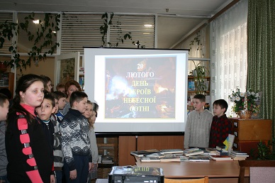 | Стояли за правду, стояли за віруСтояли за правду, стояли за віру   До Дня вшанування пам'яті героїв Небесної Сотні, 19 лютого 2020 року, учні 4-а та 4-Б  класів  КЗ КОР «Васильківська спеціальна школа І-ІІ ступенів» відвідали міську бібліотека, де відбулася година–реквієм «Стояли за правду, стояли за віру, за наше майбутнє, за всю Україну».   Завідувачка міської бібліотеки для дітей Деревянко О.М., представники Молодіжної громадської ради та лідери Учнівського парламенту міста Василькова, розповіли дітям про трагічні події на майдані Незалежності шестирічної давнини, коли Герої Небесної Сотні продемонстрували всім нам і всьому світу, що свобода – найголовніша людська цінність, а українська нація варта кращого життя та європейського майбутнього.   В цей день вихованці вшанували Героїв Небесної Сотні біля пам’ятного знаку учасникам події в місцевому парку.