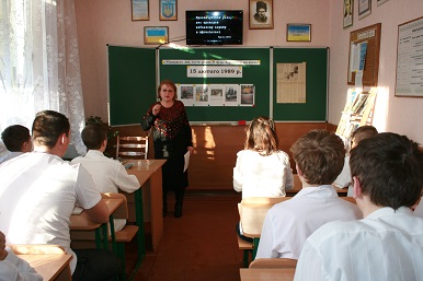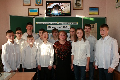 «Минають дні, ідуть роки, а біль Афгану – навіки» - під такою назвою відбувся виховний захід для учнів старших класів. Вихователь Калашник З.О. розповіла учням про те, як неодноразово ризикуючи своїм життям, воїни чесно виконували присягу, забезпечували спокій та стабільність у багатьох країнах, чим заслужили визнання і вдячність. Також діти переглянули фільм-спогад про героїв-афганців, про надзвичайно жорсткі та виснажливі умови підготовки, перемінливий клімат, щоденні думки про смерть і переживання за своє життя. Бібліотекар школи оформила тематичну виставку «Афганістан – наш біль, Афганістан – наша пам’ять», де представлені фотографії, художня література, статті з газет.