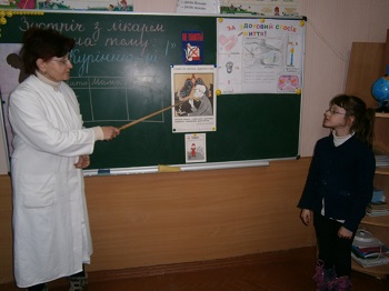 Вихователь Л.М. Рассохіна запросила до учнів 4 класу на заняття лікаря. Коли тему куріння піднімають педагоги - це один погляд на проблему, а слово лікаря - професіонала зовсім інші. Ці слова більш вагоміші, авторитетніші. |