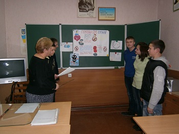 хворим та нещасним. | У 10 класі Н.Г.Куц провела анкетування. На питання анкети: «Що краще для вас – бути здоровим і щасливим, чи хворим і нещасним?». Учні відповіли: «Щоб зберегти здоровя, бути успішним у житті, потрібно не піддатися тютюновій спокусі». Зрозуміли, що потяг до сигарет нічого спільного з дорослістю й мужністю не має, навпаки, лише затримує фізичний, інтелектуальний, духовний розвиток. | Л.В. Салантій з метою збереження здоров’я та антитютюнової пропаганди серед дітей 9 класу провела тренінг «Куріння і здоров’я». Під час тренінгу учні виконували такі вправи як: «Мої очікування», «Мозковий штурм», а також працювали над завданням в групах. На завершення вихователь звернула увагу на 10 причин не починати палити, провела тести: «Чи знаєш ти про вплив тютюнового диму?». |