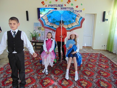Вітання учнів 3-Б класу танок "Наші серця Вам"  | Частівки у виконанні учнів 5-А, 5-Б класів  | Гуморестична інсценівка "Мрії вчителя на відпочинку"  |
