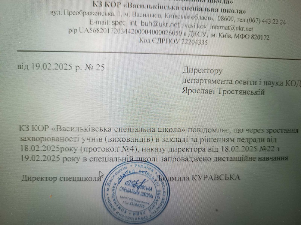 У КЗ КОР "Васильківська спеціальна школа" з 19.02.2025 року запроваджено дистанційне навчання.