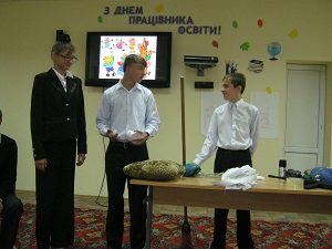 Учні 9 класу поставили гумористичну інсценівку «Магазин винаходів на допомогу дорогому вчителю». | Дорогі вчителі!Вітаємо Вас з вашим професійним святом - Днем працівників освіти. Нехай Вам завжди всміхається доля, дарує Вам міцне здоров'я та довголіття. Від імені ваших учнів бажаємо Вам здійснення найзаповітніших мрій, а також щоб у ваших родинах завжди панували тепло, радість та затишок. Пам'ятайте, що без Вас цей світ буде набагато гіршим, адже саме освітяни дають надію людству на подальший розвиток!