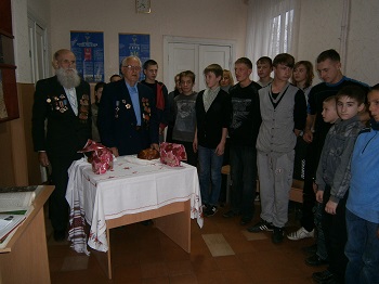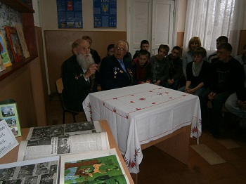 України поділився ветеран Великої Вітчизняної війни П.Я. Голубок. В кінці спогадів, ветерани, учні та вихователі