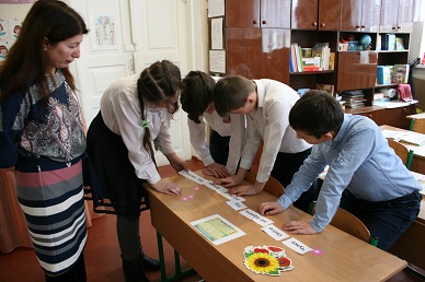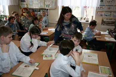 Заняття розпочалося з хвилини релаксації, мовленнєвої зарядки та визначення правил роботи на уроці. Для мовної розминки учитель використала чистомовки, скоромовки та вправи на розчитування.    З великою цікавістю діти слухали та дивились презентацію про життя та творчість української дитячої письменниці Олени Пчілки. А далі читали та обговорювали зміст байки «Котова наука». Виконуючи різні завдання, учні збирали букет для письменниці.    На уроці були використані всі форми роботи з текстом: слухання, читання мовчки, читання вголос хором, за особами, бесіда за запитаннями за змістом байки, зачитування уривків, які демонструють характеристику персонажів байки та їх поведінку.    Людмила Леонідівна використала багато цікавих форм роботи: «Кубування». «Мікрофон», роботу в групах, складання прислів’я, робота з «деформованим текстом», відгадування загадок, тестування, само оцінювання.    Четвертокласники успішно продемонстрували присутнім педагогам рівень знань і вмінь з читання на кінець початкової школи.    Урок пройшов цікаво і продуктивно.