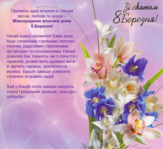 Вітання з 8 БерезняУсе найсвітліше, що є в нашому житті, пов’язане з Жінкою – берегинею людського роду, яка дає життя, піклується, підтримує, надихає, благословляє.      Спасибі всім вам за доброту і розуміння, за мудрість і терпіння, за ніжність і турботу.